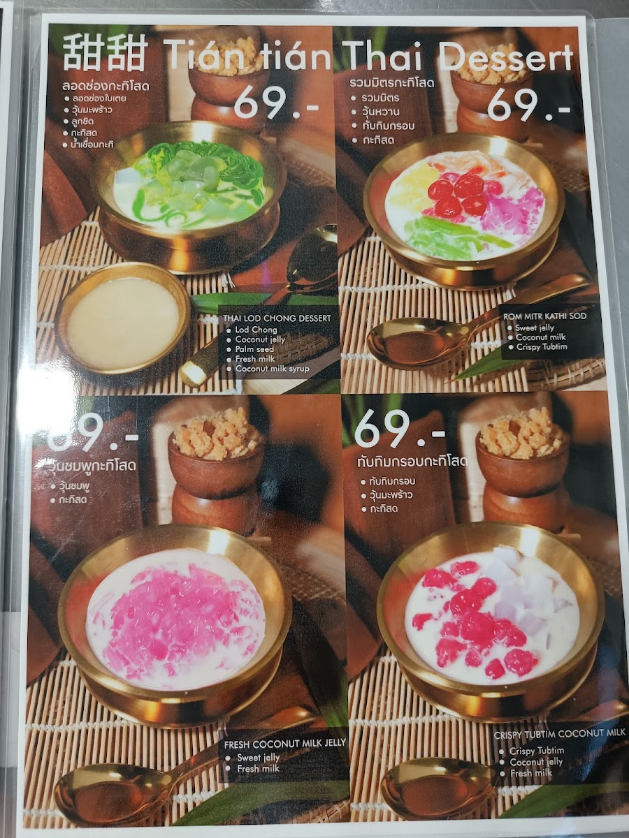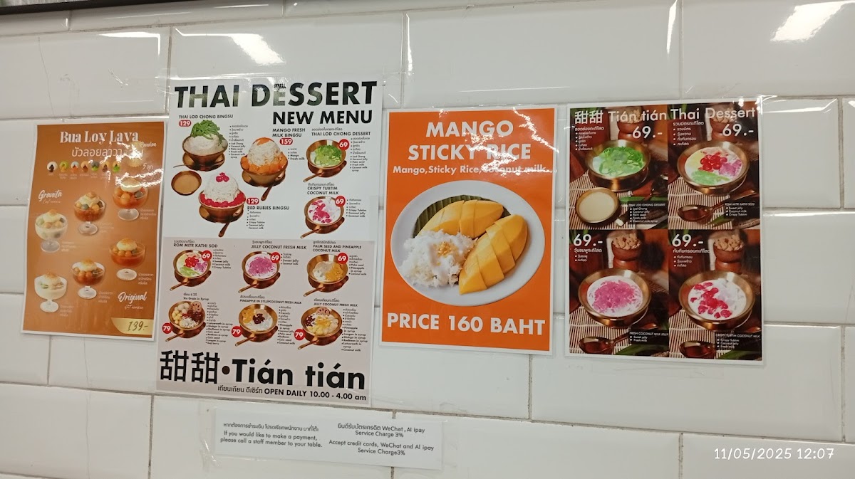 You’ll find highlights like the tangy Mixed Papaya Salad Platter and the robust Tom Yum Kung alongside satisfying grilled specialties such as ไส้ย่าง (grilled intestines) and กุ้งแช่น้ําปลา (shrimp marinated in fish sauce). Lighter options like Mango Salad and Steamed Prawns with Vermicelli complement heartier plates, while sweet finishes like Mango Sticky Rice and Thai milk tea offer a gentle close to the meal.