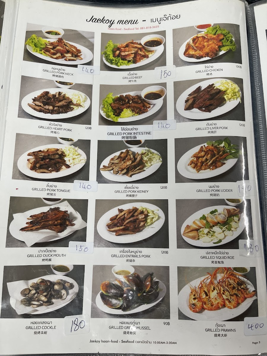 Jaekoy เจ๊ก้อย ส้มตำอาหารอีสาน offers a straightforward menu centered on authentic Northeastern Thai (Isaan) flavors. The selection is balanced between familiar comfort foods and more adventurous dishes, making it suitable for casual meals any time of day. Whether you’re dropping in for a quick late-night bite or sharing a relaxed dinner with friends, the menu’s variety caters to different appetites and moods.